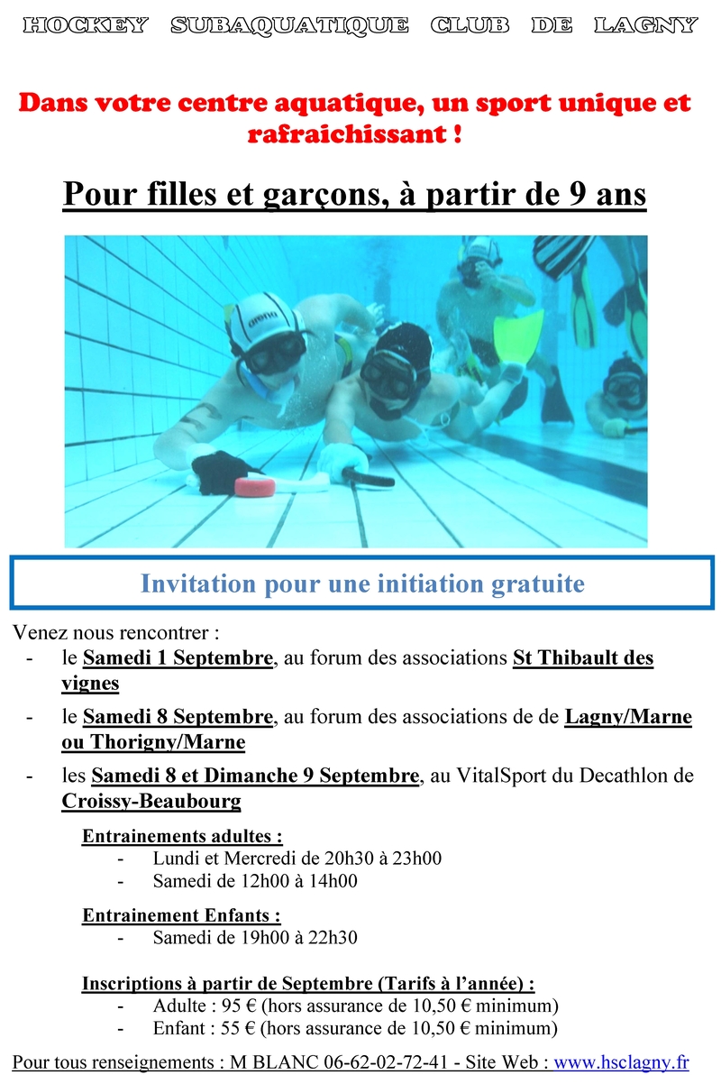 Si vous ne pouvez pas venir à ces manifestations, imprimez cet article et venez nous retrouver à la piscine de Lagny le lundi 10 septembre pour les adultes ou le samedi 15 septembre pour les jeunes.