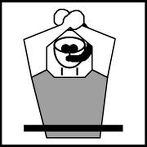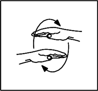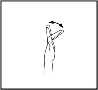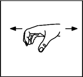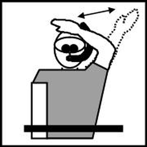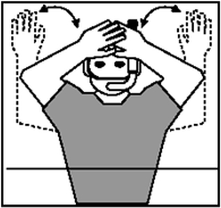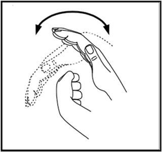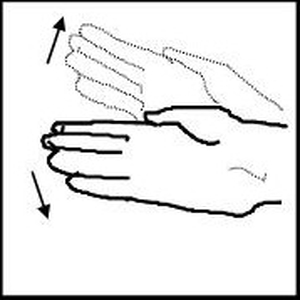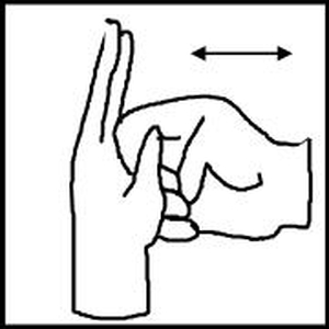 Le si gn e e st u n mou v e ment d e h ach ag e d ' un e ma i n sur l e mi li e u d e l ' avan t -b r as d e l ' aut r e b r as. O n ti e nd r a l ' avan t -b r as p a r al l è l e à l a poi t r i n e à l a d i stan ce d' u n br as