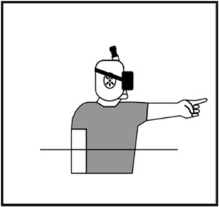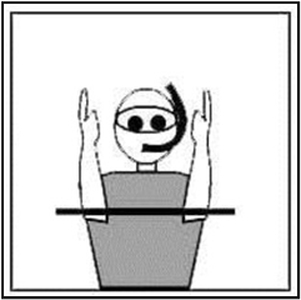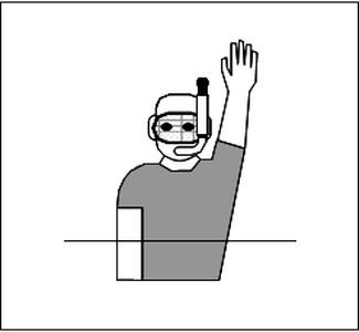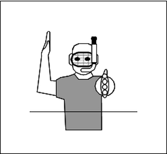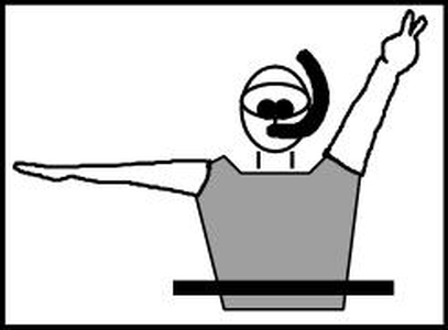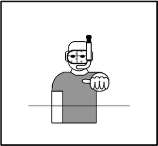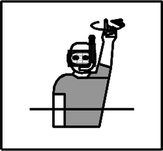 Un aver t i sse m e n t d ' ar b i t r e e st i n d i qu é p ar u n b r as t e nd u fe r m e ment , t e n u p ar al l è l e à l a surf ac e d e l 'e au e t perp e nd i cu l a i r e à l a p o it r i ne . La m ai n for mé e e n p o i n g ave c l e p o u ce t e nd u parall è l e à l a s u r f ace d e l 'e au