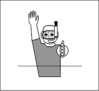 O n s i gn al e un e f aut e p o u r re t a r de r l e J e u i mp li qu a n t l a z o n e du c o i n de l ' ai r e de j e u , e n mett an t un e mai n s u r l 'é p au l e o ppo sée , l e br as hor i z o nt al