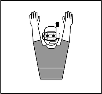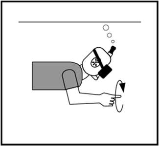 Le si gn a l e st u n b r as t e nd u ve r s l e h au t ave c l ’ i nd e x p o i nt é ve r s l e h aut . O n fai t al or s t o u r ne r l a ma i n p l u s i eur s f o i s, d e fa ço n à fai r e d é c r i r e à l ’ ind e x u n cer cl e i ma g i n a i r e au - d e ss u s d e l a tê t e , paral lè l e à l a surf a ce d e l ’e au