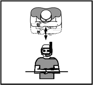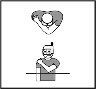 Le si gn e se fai t ave c u n avan t -b r as e t l a ma i n e n lign e , d o i gt s j o i nt s e t al i gn é s. L' avan t - b r as e t l a ma i n so n t t e nu s p ar al l è l e s à l a surf a ce d e l ’e au , ave c l a p au me t o u r n é e ve r s l a p o i t r in e , e t il s so n t ma i nt e nu s l o i n d e l a p o it r i n e à un e d i stan ce c o r r e spo nd an t à l a l o ngu e u r d u b r as . L ' aut r e ma i n fai t a l or s u n m o u ve m e n t d e p l o ng eo n p ar -d e s sus l ’ avan t - b r as i mm o b ili sé , i m i t a n t u n p a l e t t i r é au -d e ssu s d ' un e b arr i è re . C e s i gn e d o i t a l or s ê tr e sui v i du s i g n e app ro p r i é : e ntr e -d e u x o u c o u p - fr an c